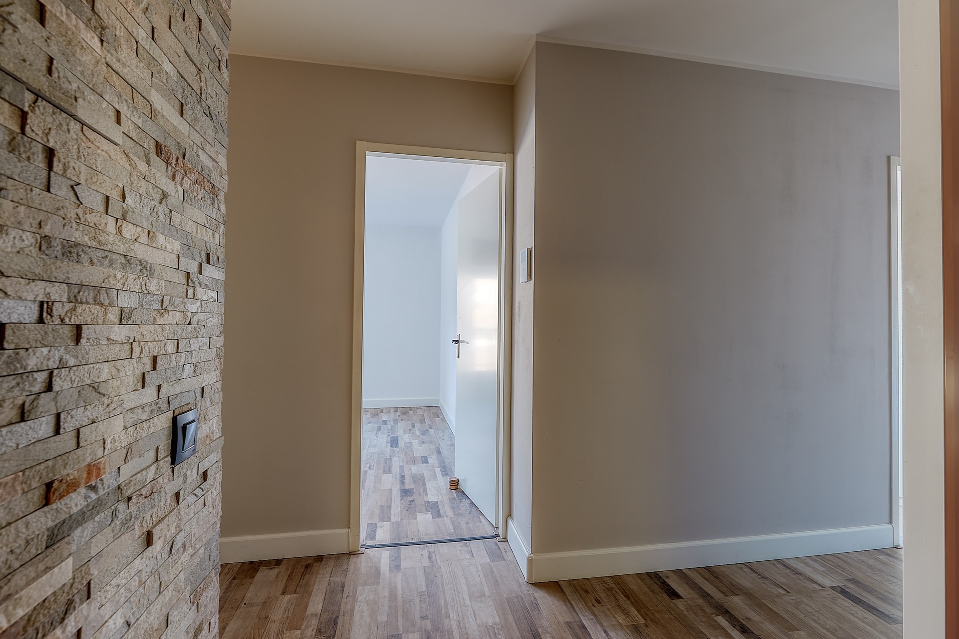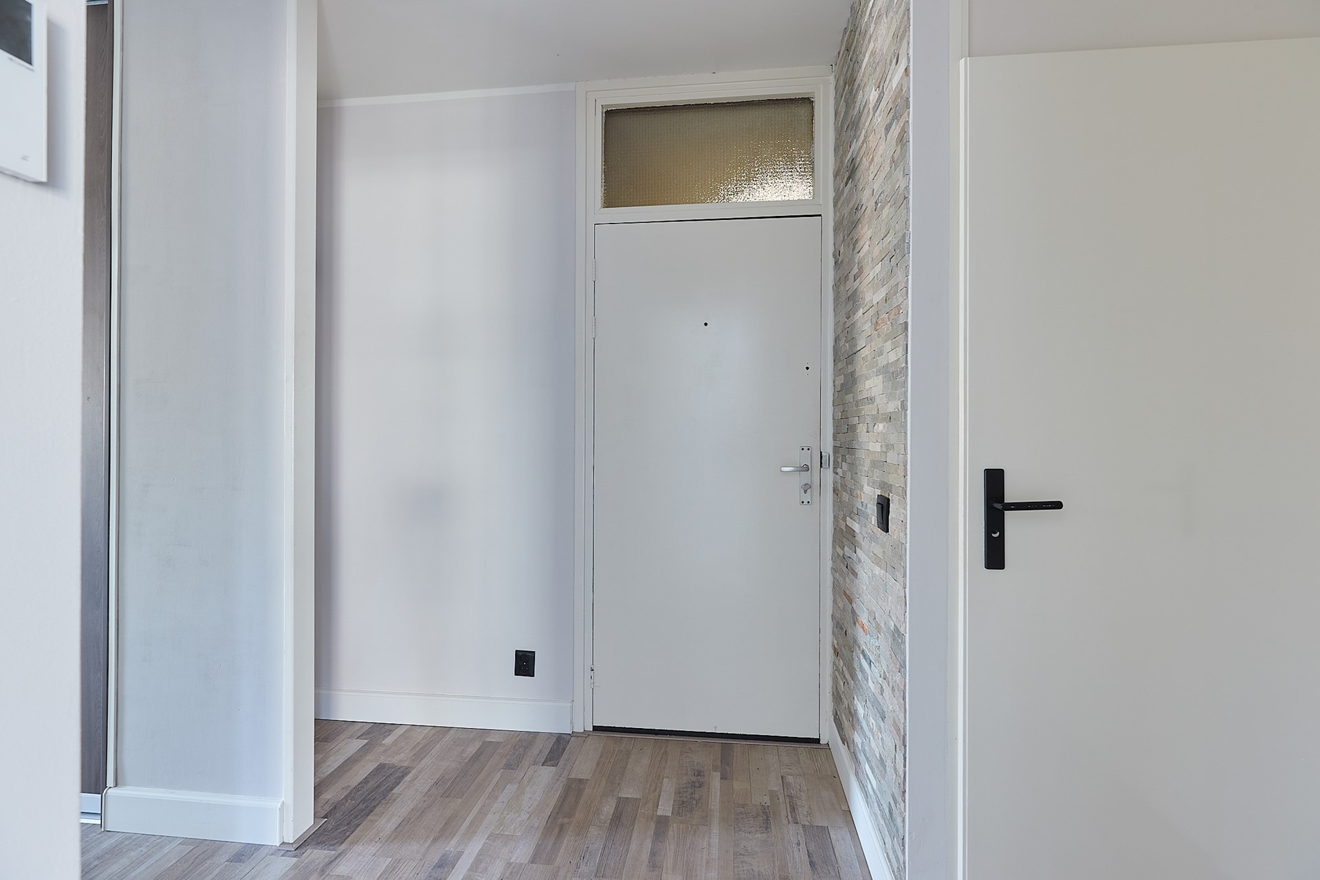Entree van de woning op de vierde verdieping, ruime hal voorzien van betegelde vloer en toegang tot de voordeur.