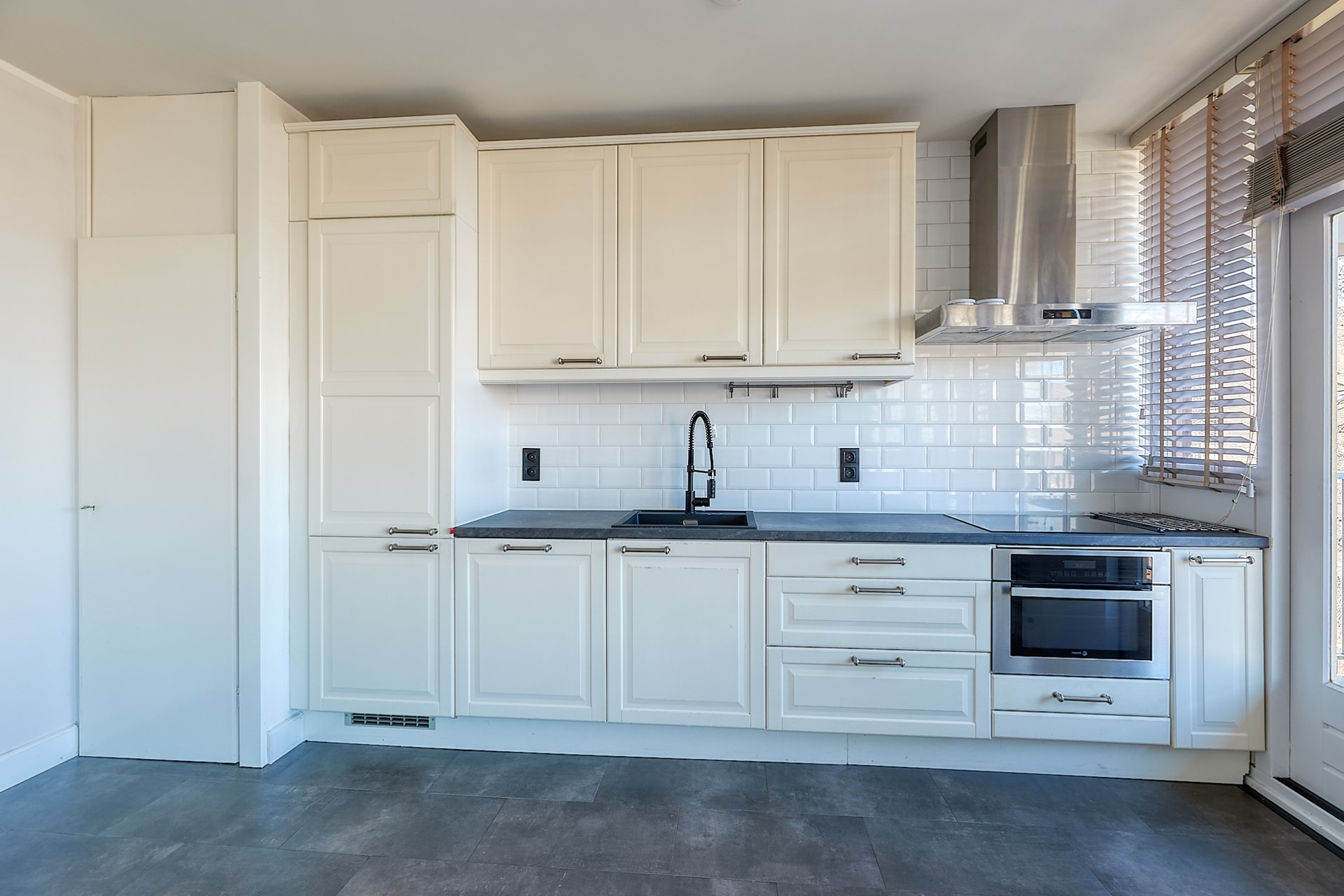 Smaakvolle keuken met elektrische kookplaat met afzuigkap, ingebouwde oven en ruimte voor koel-vries combinatie.