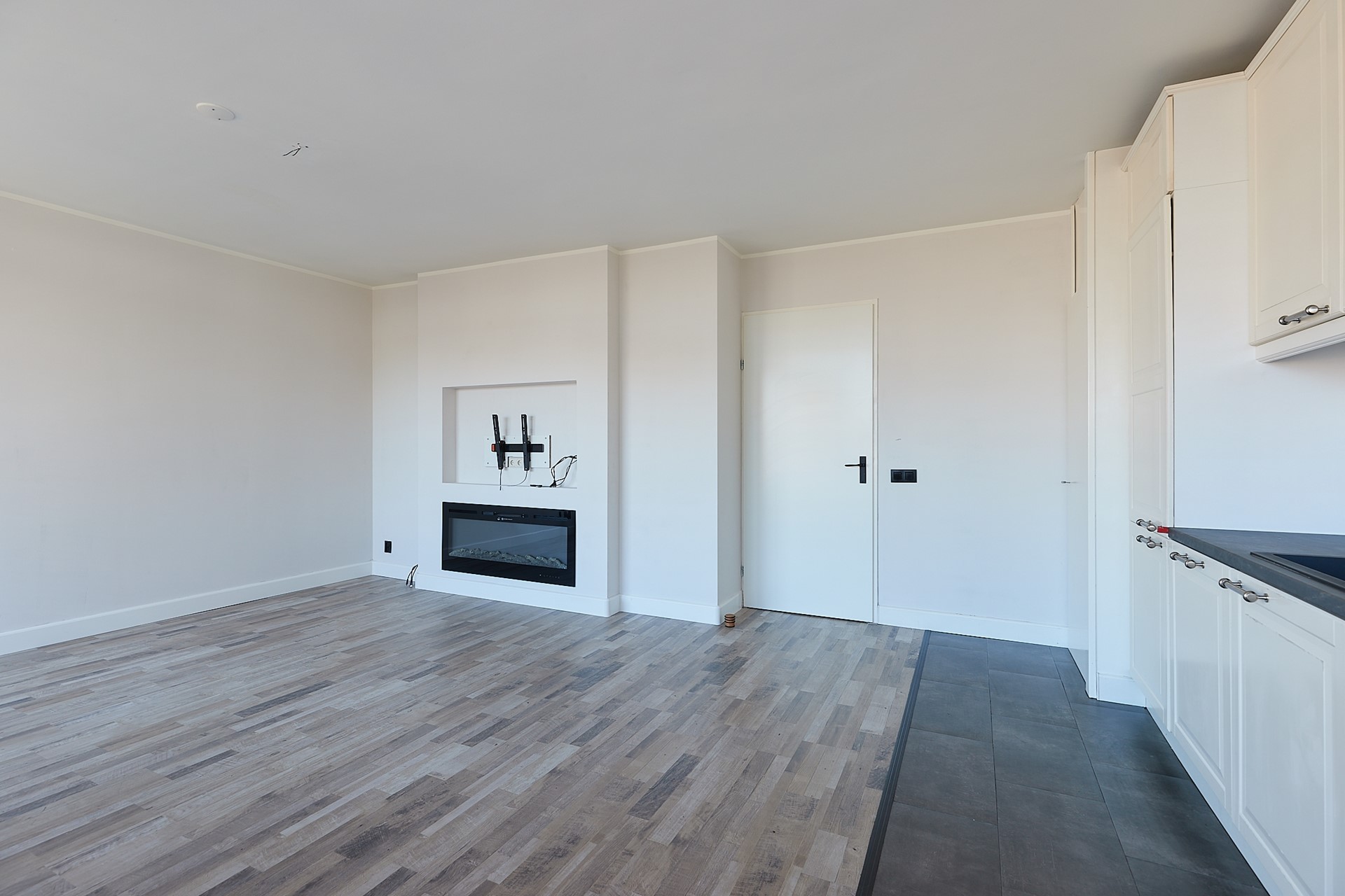 Woonkamer met een vaste kast open keuken en toegang tot het balkon,