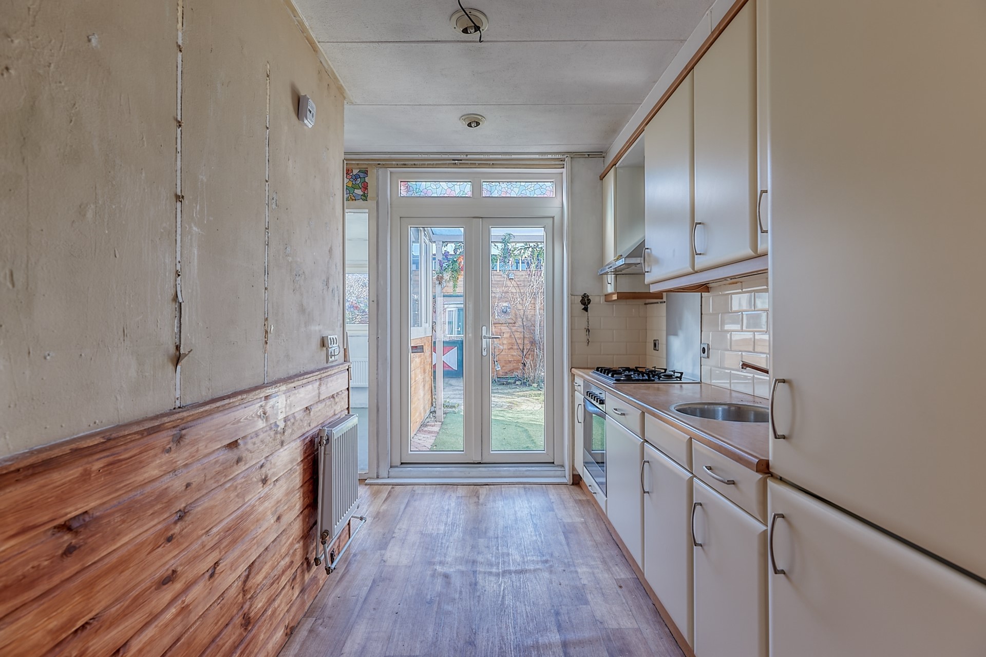 oven, koel/vriescombinatie, vaatwasser, afzuigkap en spoelbak, openslaande dubbele deuren naar de zonnige achtertuin.
