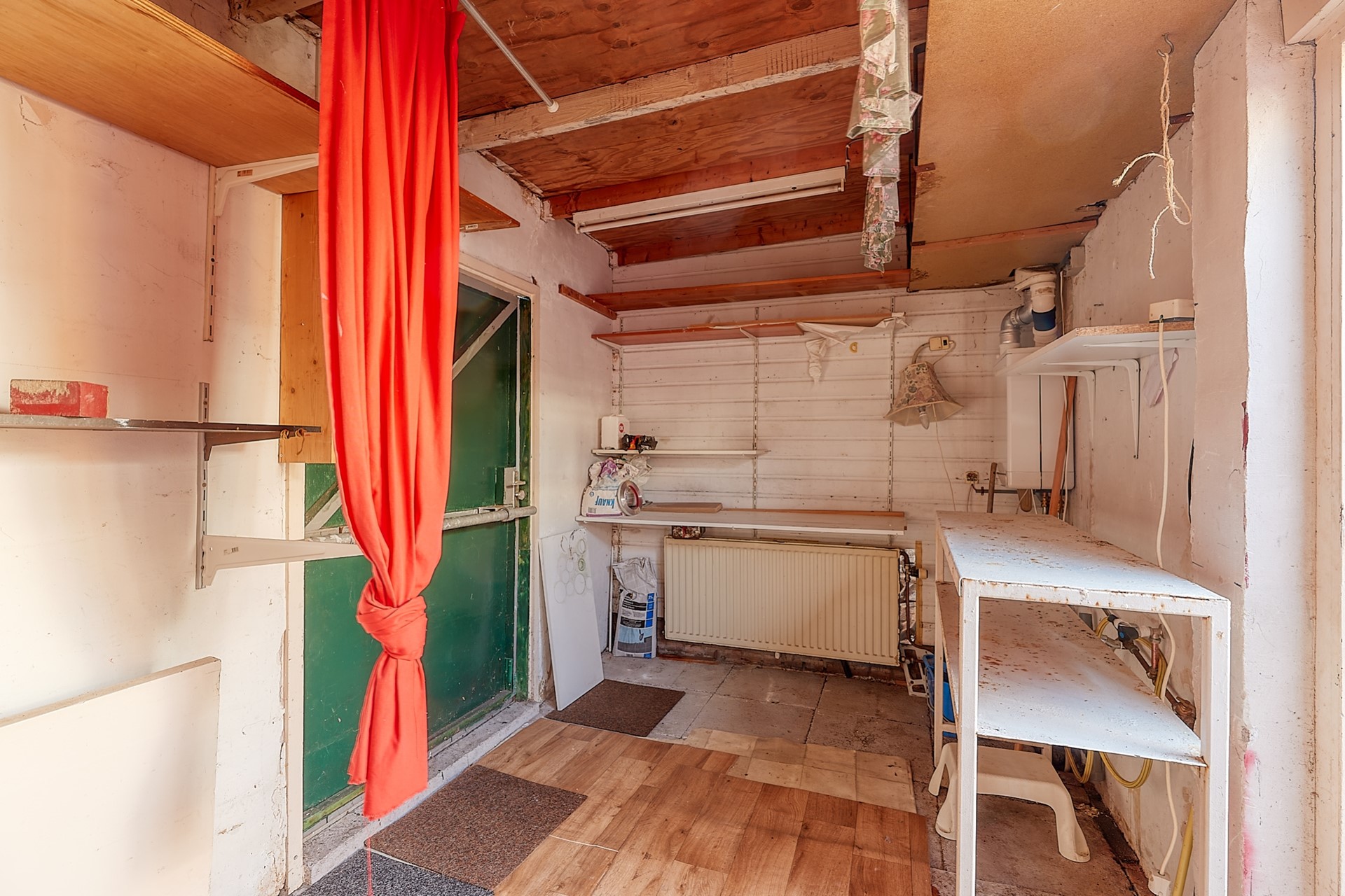 Vrijstaande houten berging voorzien van elektra, met opstelplaats voor HR Combi-ketel.
