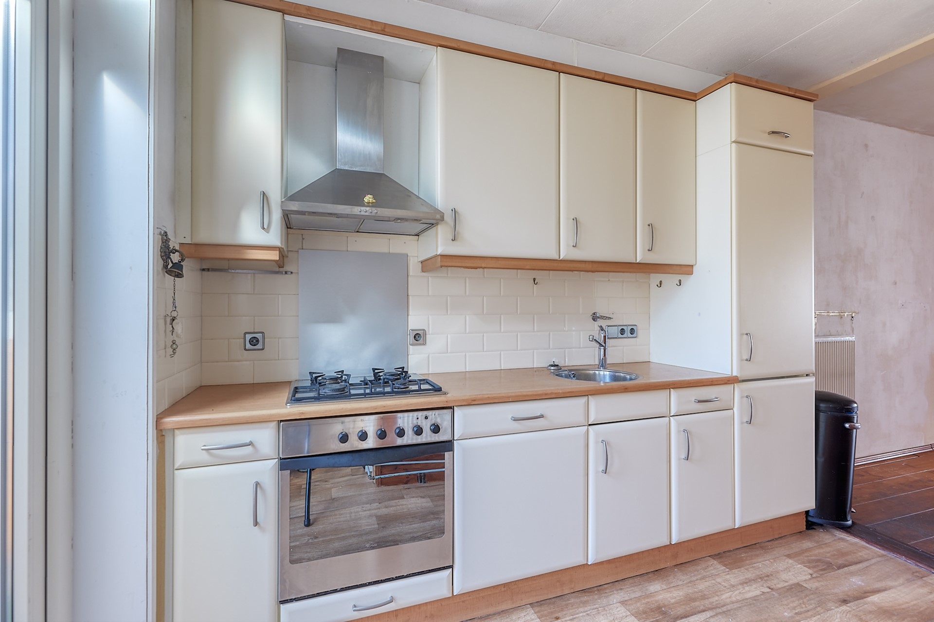 Halfopen eenvoudige keuken voorzien van diverse inbouw apparatuur, o.a. 4 pits gaskookplaat,